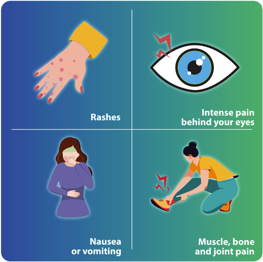 Besides high fever, dengue fever typically presents with the following symptoms:1,3,4
