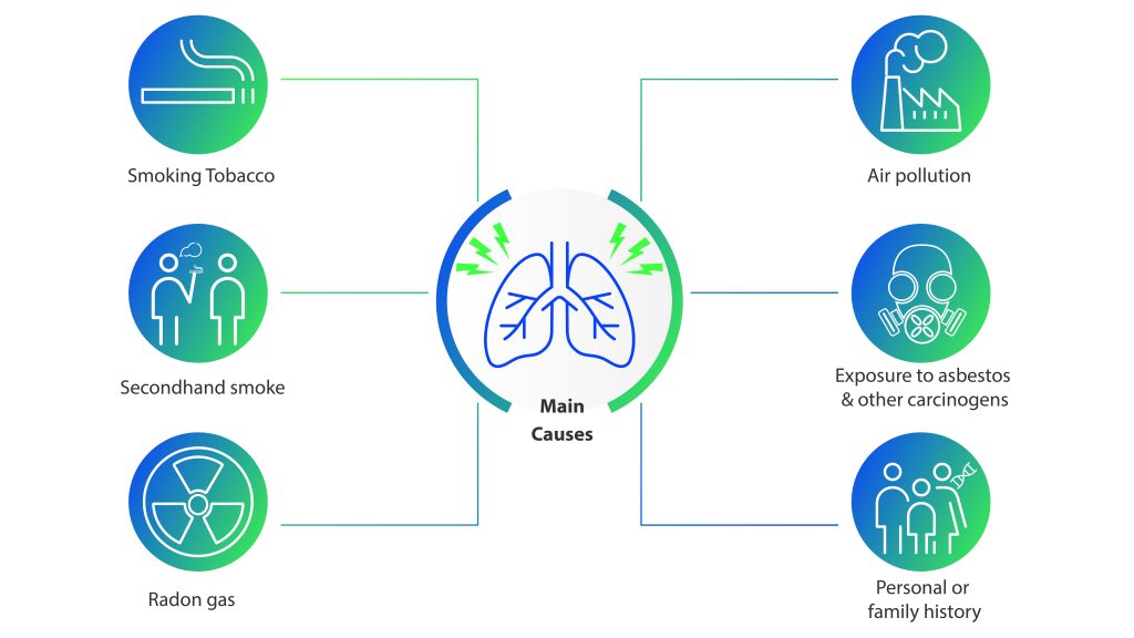 Lung cancer begins in the lungs and can spread to other parts of the body.2,3 There are two main types: non-small cell lung cancer (NSCLC) and small cell lung cancer (SCLC), with NSCLC being the more common.1,4 While smoking is the leading cause, non-smokers are not immune; factors like exposure to radon gas, asbestos, and air pollution also play significant roles. Genetic predispositions and family history can further increase risk. Non-smokers, particularly women, have been diagnosed with the disease2, even though fewer than 2% of Malaysian women smoke.5